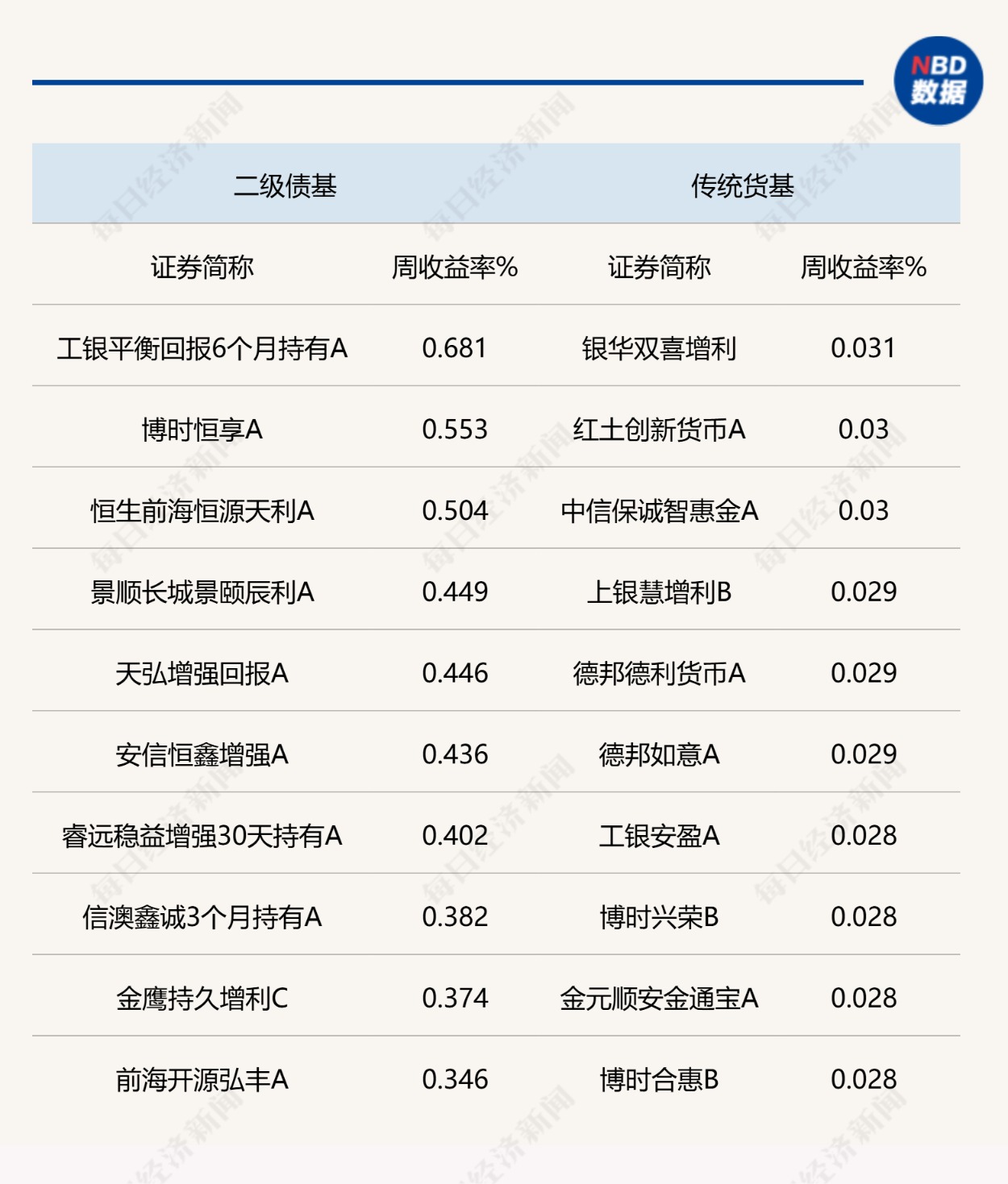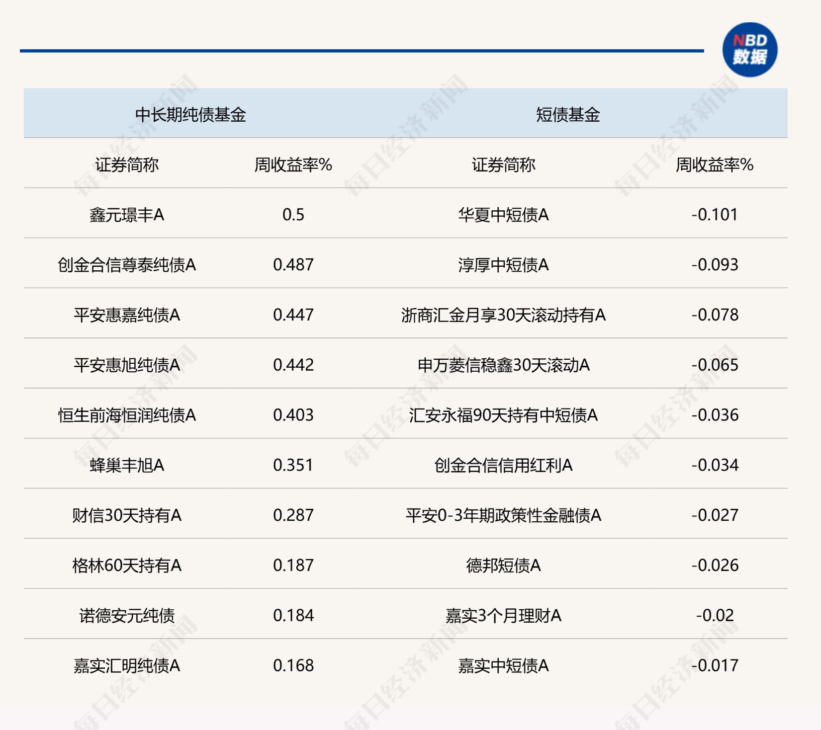 说明:上周各类公募债基头部业绩产品统计来源:Wind